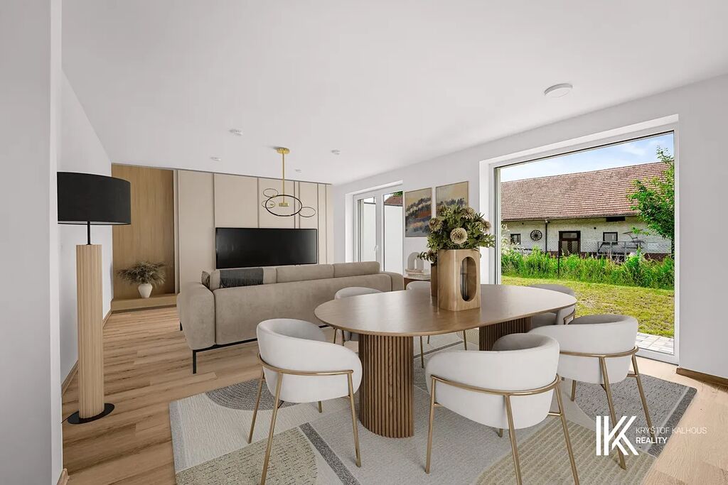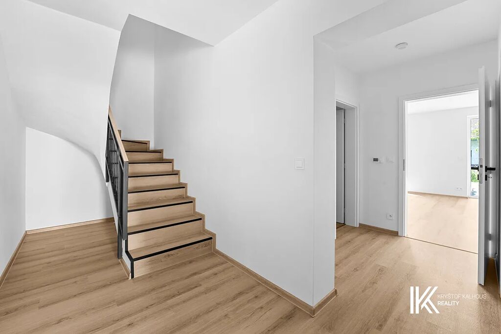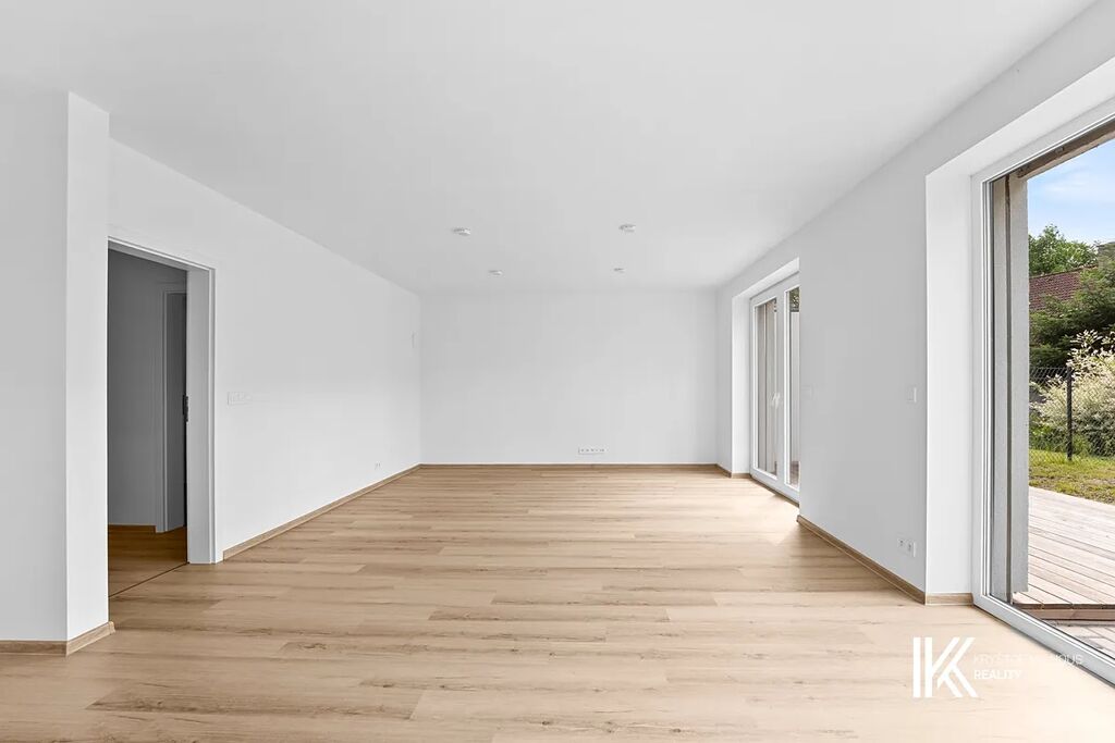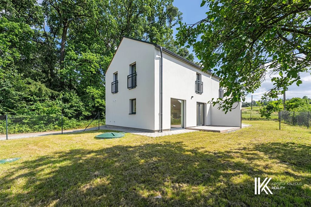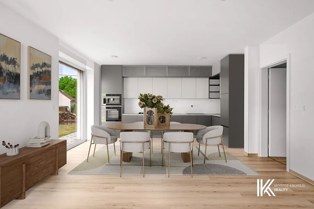 Samotný dům vás přivítá jako harmonicky navržená novostavba s praktickou dispozicí 4+kk a užitnou plochou 107 m². V přízemí vás osloví především prostorný, západně orientovaný obývací pokoj, jehož velká okna zaplavují interiér přirozeným světlem a přinášejí nádherný výhled do vlastní zahrady. Odtud vedou dveře přímo na terasu, kde si snadno vytvoříte venkovní posezení, prostor pro grilování nebo dětský koutek s pískovištěm. Kuchyňský kout je připraven tak, abyste si mohli splnit svůj sen o kuchyni na míru, od barev po vybavení, přesně podle vlastního vkusu.