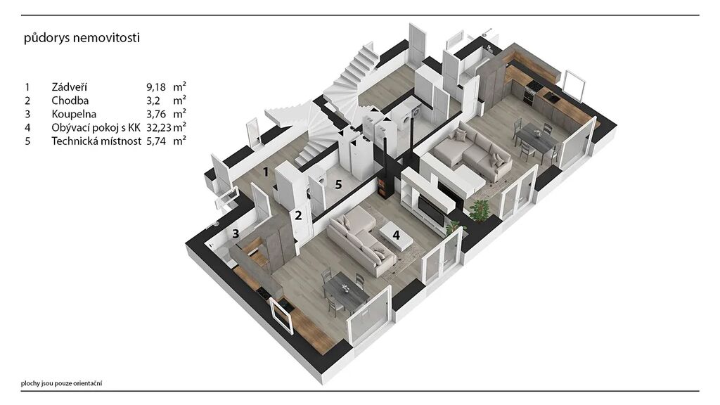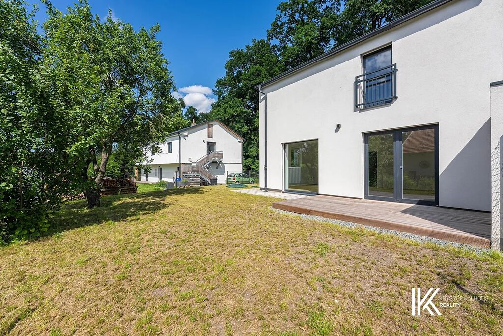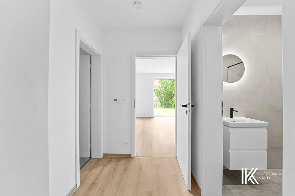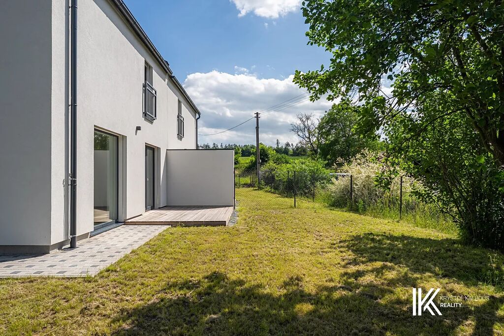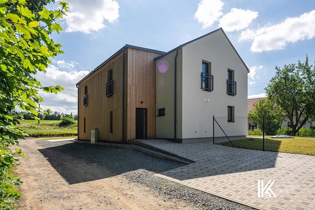 Samotný dům vás přivítá jako harmonicky navržená novostavba s praktickou dispozicí 4+kk a užitnou plochou 107 m². V přízemí vás osloví především prostorný, západně orientovaný obývací pokoj, jehož velká okna zaplavují interiér přirozeným světlem a přinášejí nádherný výhled do vlastní zahrady. Odtud vedou dveře přímo na terasu, kde si snadno vytvoříte venkovní posezení, prostor pro grilování nebo dětský koutek s pískovištěm. Kuchyňský kout je připraven tak, abyste si mohli splnit svůj sen o kuchyni na míru, od barev po vybavení, přesně podle vlastního vkusu.