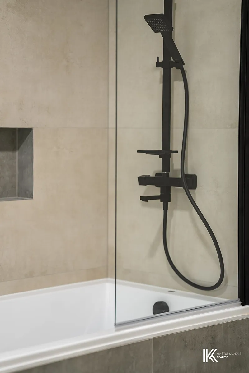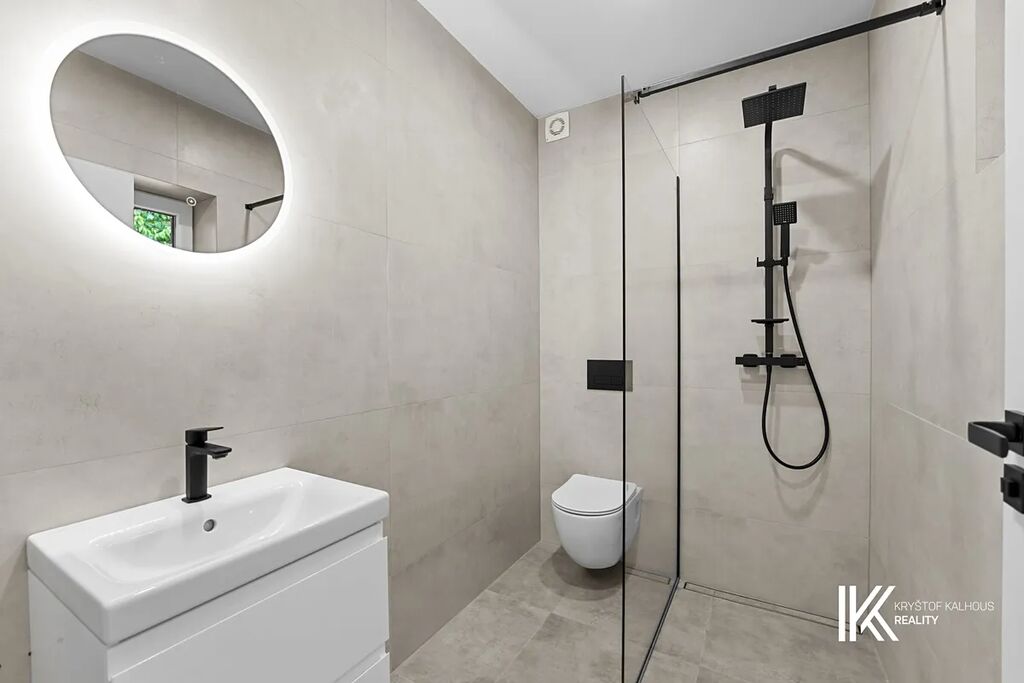 Na stejném podlaží se nachází koupelna se sprchovým koutem a toaletou, která je prakticky umístěna nedaleko vstupu a skvěle poslouží i návštěvám. Technická místnost pak umožní uložit pračku, sušičku a další domácí potřeby, takže v obytné části domu zůstane dostatek místa a čistý, vzdušný dojem.