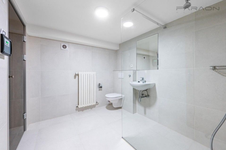 V přízemí se nachází vstupní předsíň a plně vybavená kuchyň (sklokeramická deska, trouba, mikrovlná trouba, lednice, mrazák a myčka. Navazuje jídelna s prostorným obývacím pokojem a krbem, samostatným pokojem a koupelnou. Technická místnost, prádelna a sauna s odpočinkovou místností.