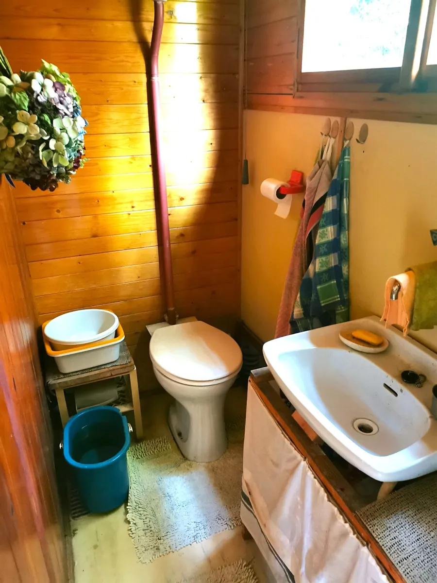 Přízemí: obývací pokoj s kuchyňským koutem, toaleta s umyvadlem, kamna.