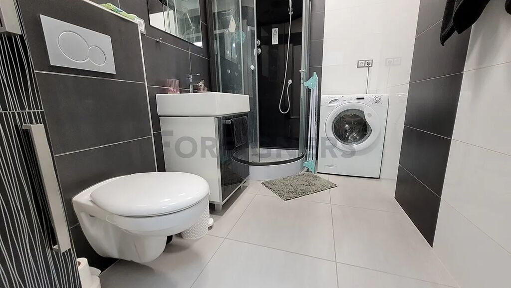 V koupelně se nachází sprchový kout, toaleta, umyvadlo, skříňka a pračka!