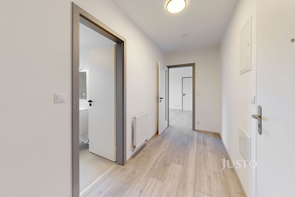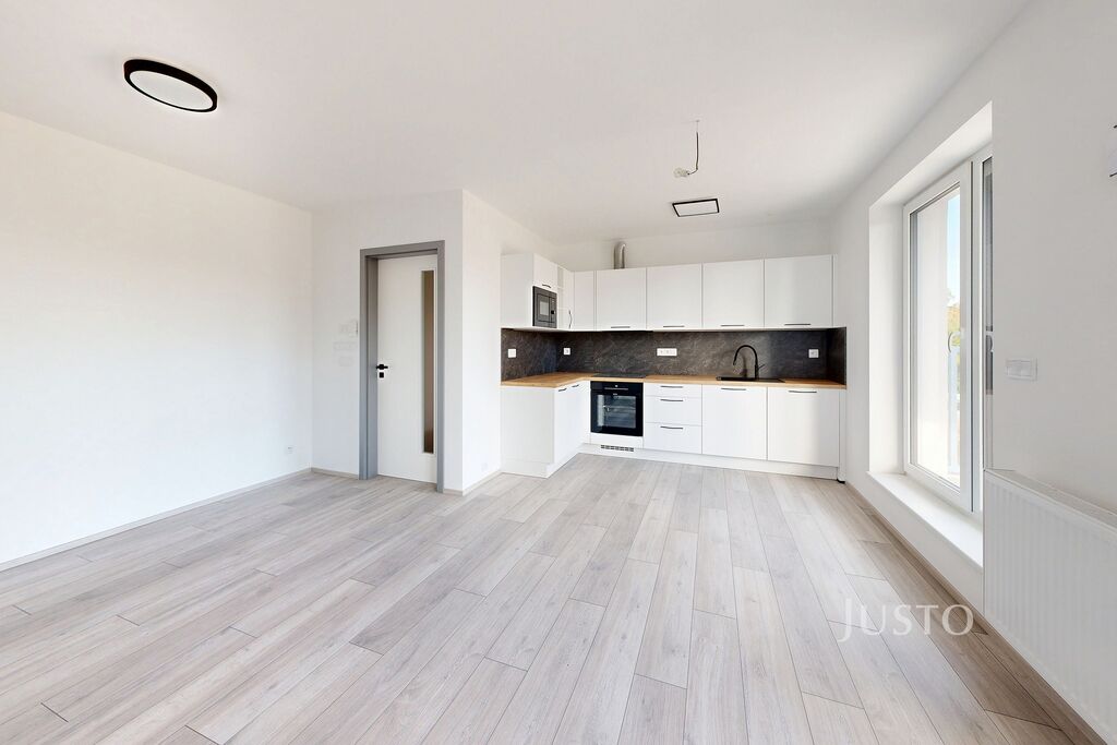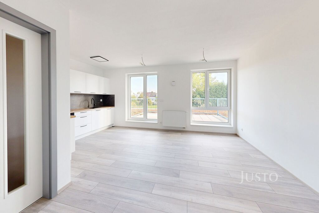 Dominantou bytu je světlý obývací pokoj s kuchyňským koutem o ploše 23,1 m² s přímým vstupem na terasu orientovanou na jih, odkud si můžete užívat příjemný výhled do zeleně. Kuchyňská linka je vybavena moderními spotřebiči – myčkou, elektrickou varnou deskou, troubou a mikrovlnnou troubou. Byt nabízí také samostatný pokoj (12,3 m²), vhodný jako ložnice nebo pracovna.
