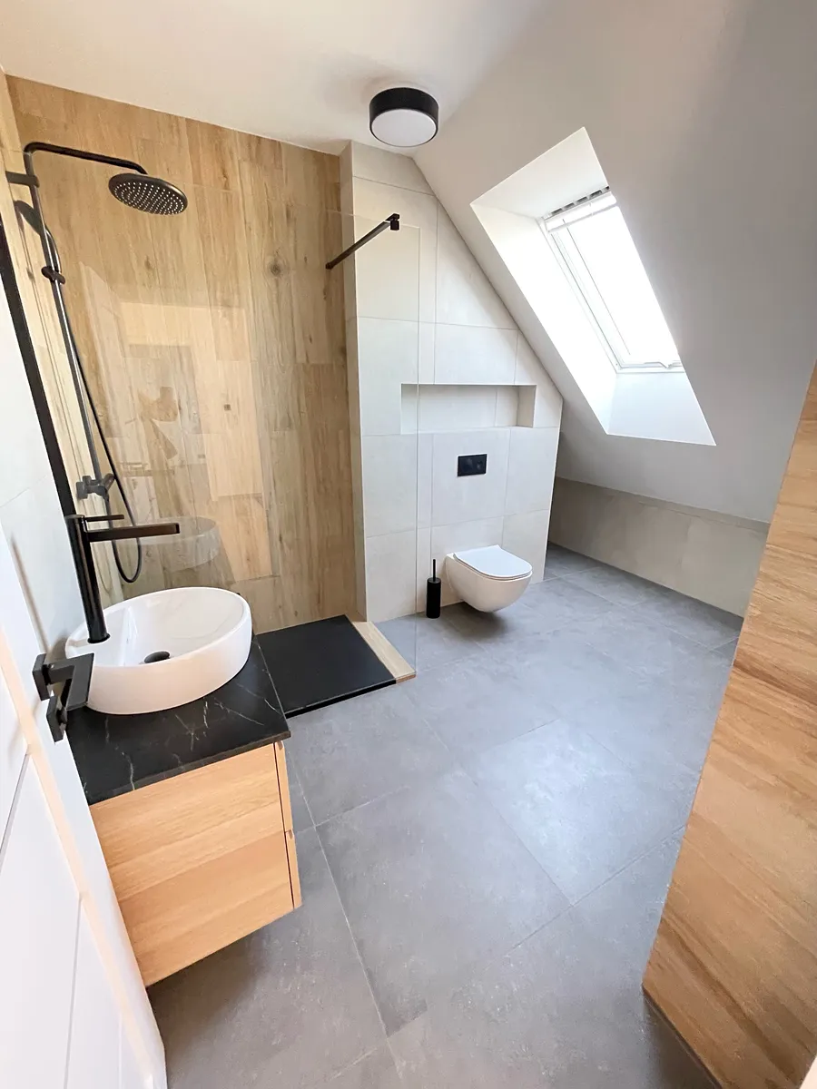 Horní část bytu nabízí tři samostatné ložnice, koupelnu a terasu. Ve vkusné koupelně je sprchový kout, vana, umyvadlo a druhé WC.