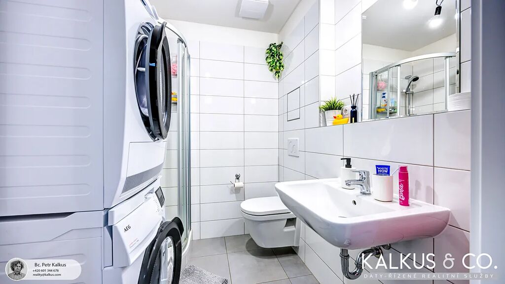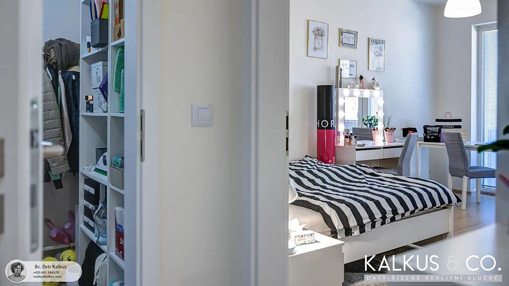 Kuchyňská linka je vybavena vestavěnými spotřebiči (myčka, lednice s mrazákem, horkovzdušná trouba a sklokeramická varná deska). Koupelna disponuje sprchovým koutem, WC a prostorem pro pračku/sušičku. Všechny místnosti jsou přístupné z centrální předsíně, včetně praktické šatny/komory. V celém bytě jsou laminátové podlahy, v předsíni a koupelně je položena dlažba. Na osvětleném balkónu je vyvedena zásuvka na 220V a prostor pro venkovní nábytek.