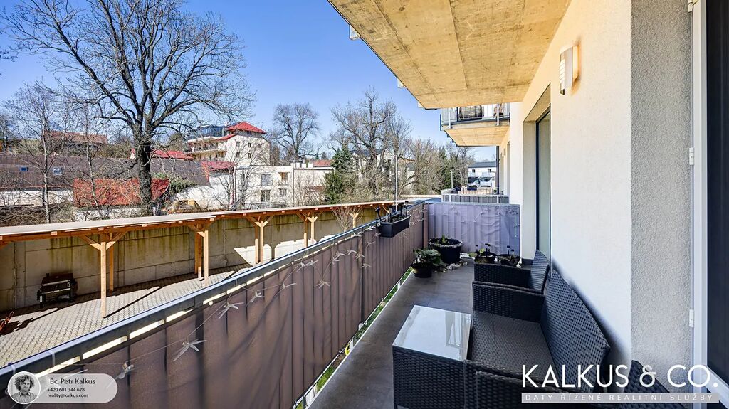 Funkční 3zóna kuchyně-jídelna-obývací pokoj je – stejně jako ložnice – propojena velkoformátovými okny a dveřmi s balkónem o výměře 10 m². Oba pokoje k tomu nabízí nezastavěné výhledy do údolí Kněživky se vzrostlými stromy.