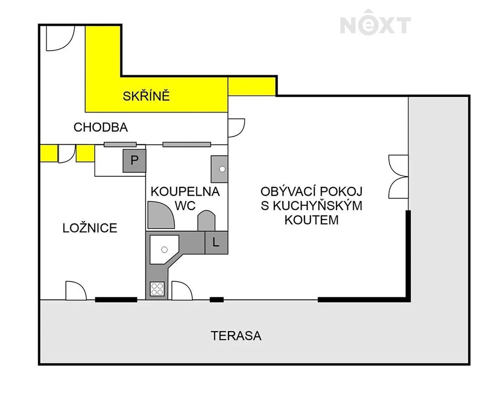 Moderní byt o ploše 58 m² s terasou o velikosti 36 m² se nachází ve 2. nadzemním podlaží bytového domu s výtahem a disponuje velkorysou terasou ve tvaru L, která obklopuje celý byt. Na terasu je přístup ze všech místností i z kuchyně.