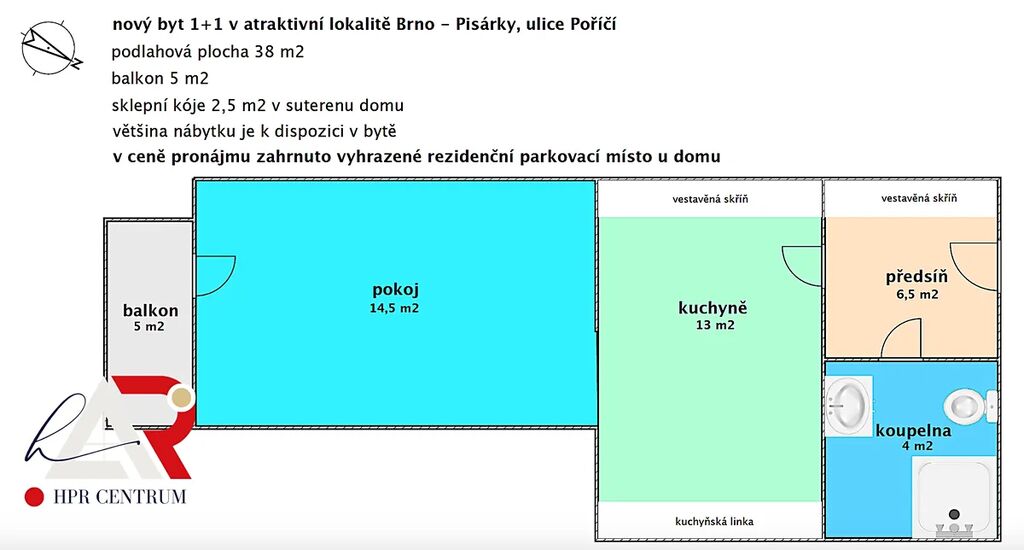 Nabízím vám k pronájmu byt, který se nachází v atraktivní lokalitě Brno – Pisárky, na ulici Poříčí. Byt je umístěn ve 2. patře v nedávné době postaveného cihlového bytového domu. Dispozice bytu je 1+1 s tím, že kuchyňský kout je od obytné části separován elegantní praktickou stěnou, díky níž si jej v případě potřeby můžete opticky zcela oddělit. Celková plocha bytu činí 38 m2, balkon, kterým byt také disponuje, má plochu dalších 5 m2. K bytu dále náleží taktéž sklepní kóje (plocha 2,5 m2) v suterénu domu. Komfort bytu zvyšuje rekuperace, která v bytě vyměňuje vzduch, aniž byste otevírali okna (rekuperace samozřejmě ještě spoří náklady na vytápění, což je další pozitivní dopad na komfort užívání bytu pro nájemce). Byt je situován u frekventované ulice Poříčí, avšak díky již zmíněné rekuperaci a také trojitým sklům v oknech nebudete slyšet projíždějící vozy a přitom můžete větrat, aniž byste otevřeli okno. Lokalita nabízí výbornou dostupnost bytu jak autem, tak také MHD – autobusem, popřípadě i tramvají (Mendlovo náměstí je vzdáleno 3 minuty chůze od domu). S parkováním také nemusíte mít obavu, neboť si můžete pronajmout od majitele parkovací stání v atriu domu (pronájem parkovacího místa není zahrnut v ceně pronájmu bytu). K dispozici je vám, mimo uvedeného sklepa (a možnosti pronájmu parkovacího místa), také kočárkárna v suterénu domu. Využijte bydlení v krásném bytě s atraktivní adresou na „starém Brně“ a sjednejte si prohlídku ještě dnes. Majitel upřednostňuje nájemce nekuřáky, bez dětí a domácích zvířat. V případě jakýchkoli dalších informací jsem Vám k dispozici. Byt je k dispozici od 1.12.2025.