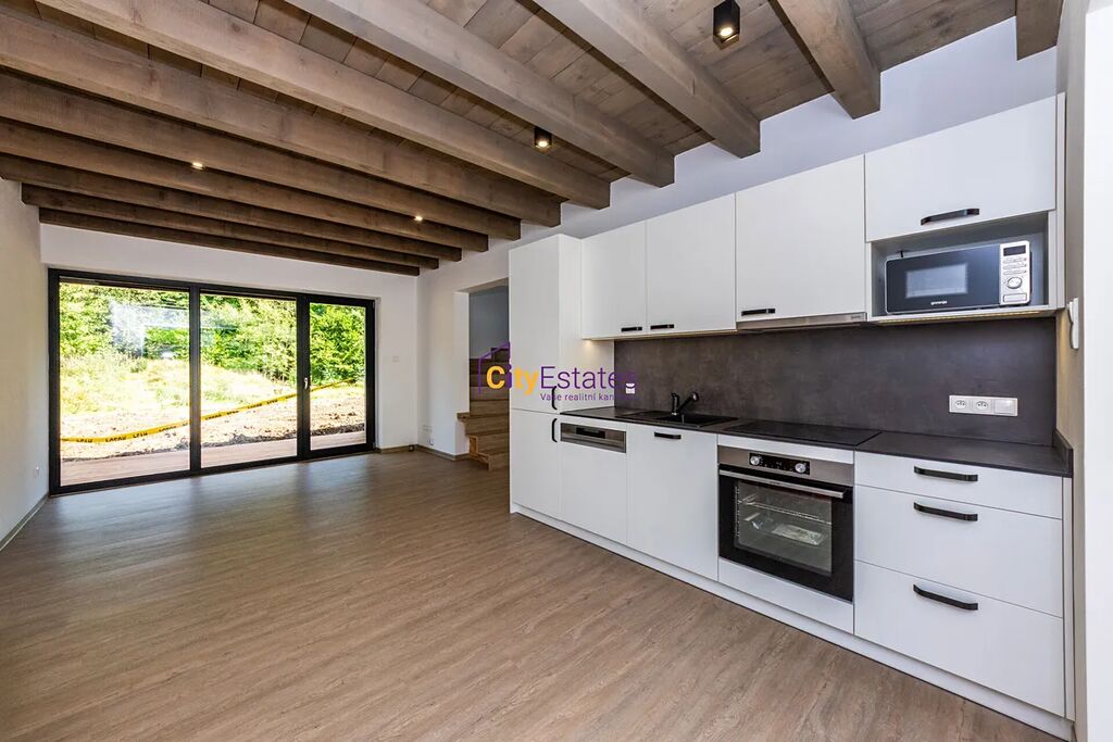 Do bytu vstoupíte chodbou, kde je i šatna o velikosti 3,8m. Dále je zde prostorný obývací pokoj s plně vybavenou kuchyní o výměře 29,7m2, dva pokoje 9,7m2, a 10,3m2, koupelna s toaletou 4,2 m2, sklad 5,2m2, terasa 15m2, zahrada 112m2 a parkovací stání.