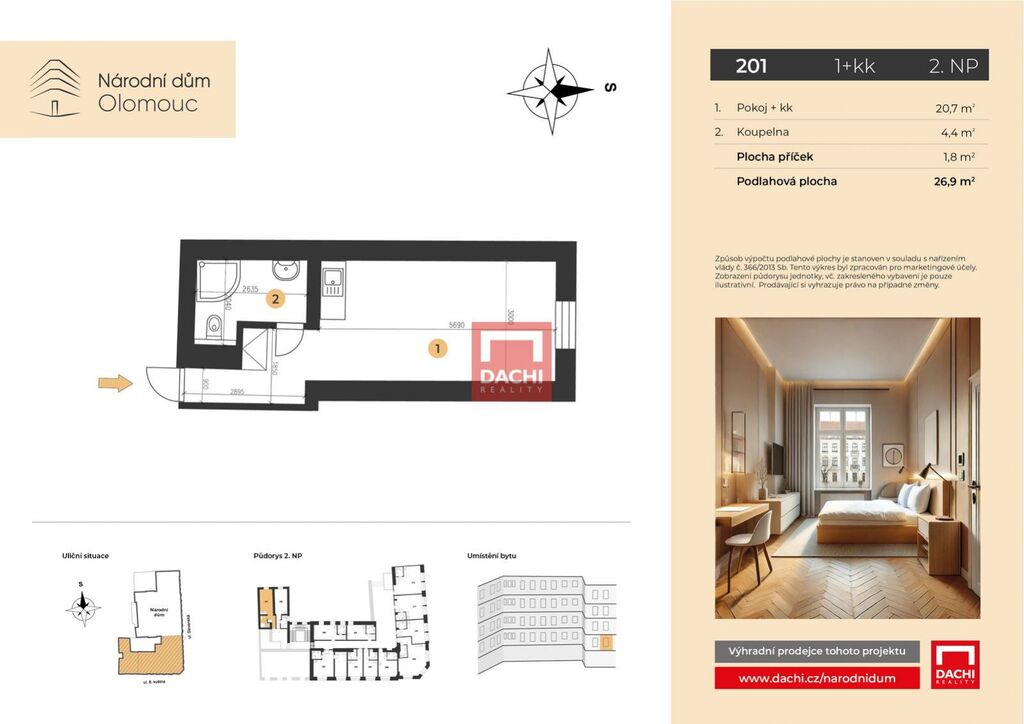 V rámci projektu nabízíme byt č. 201 o dispozici 1+kk s podlahovou plochou 26,9m, který se nachází ve 2. nadzemním podlaží.