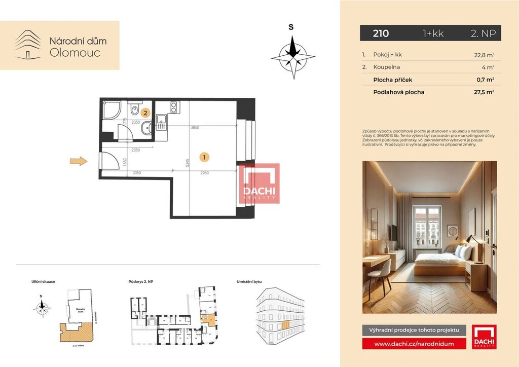 V rámci projektu nabízíme byt č. 210 o dispozici 1+kk s podlahovou plochou 27,5m, který se nachází ve 2. nadzemním podlaží.