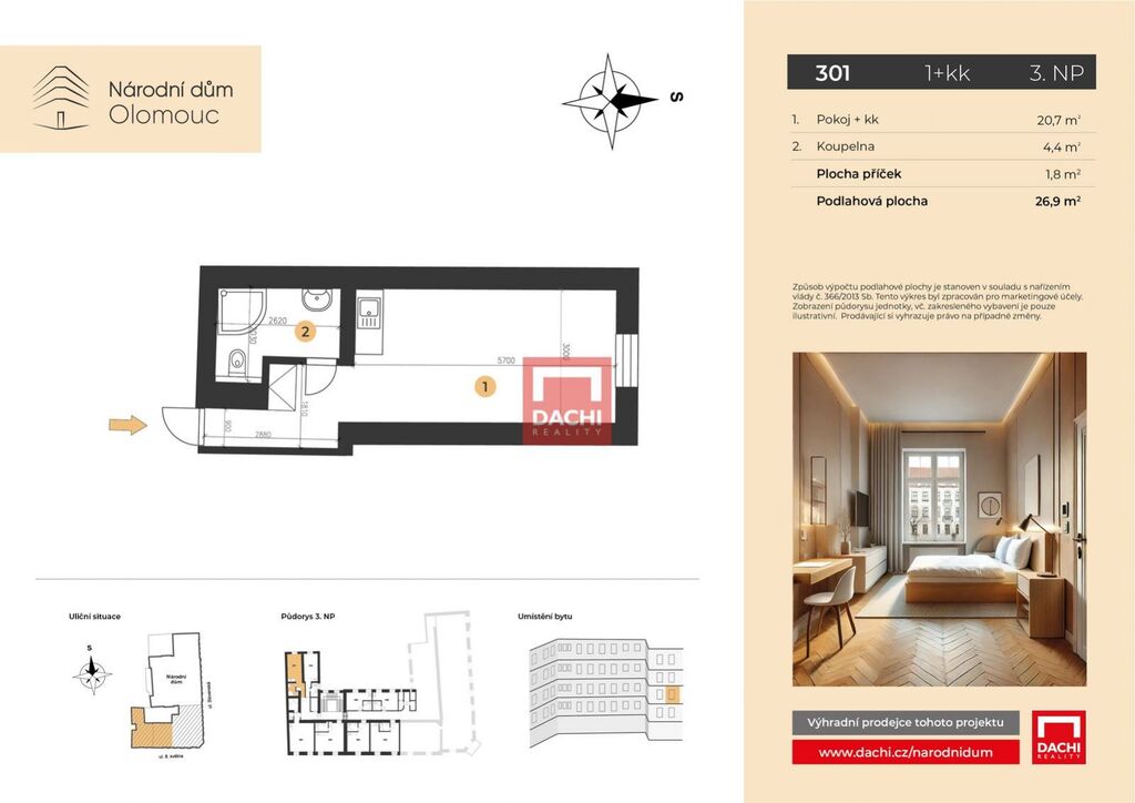 V rámci projektu nabízíme byt č. 301 o dispozici 1+kk s podlahovou plochou 26,9 m, který se nachází ve 3. nadzemním podlaží.