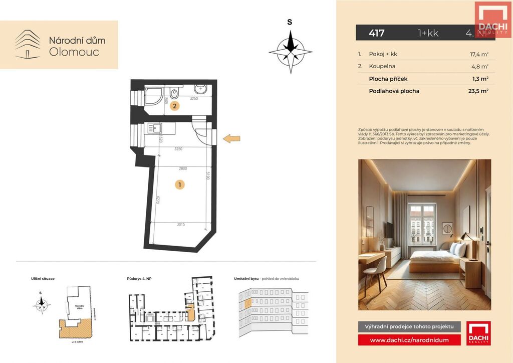V rámci projektu nabízíme byt č. 417 o dispozici 1+kk s podlahovou plochou 23,5m, který se nachází ve 4. nadzemním podlaží.