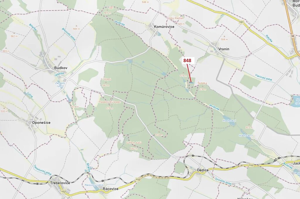Lesní pozemek o výměře 2 338 m2, parcelní číslo 848, podíl 1/1, katastrální území Vranín, obec Moravské Budějovice, obec s rozšířenou působností Moravské Budějovice, okres Třebíč, Kraj Vysočina. Po těžbě.