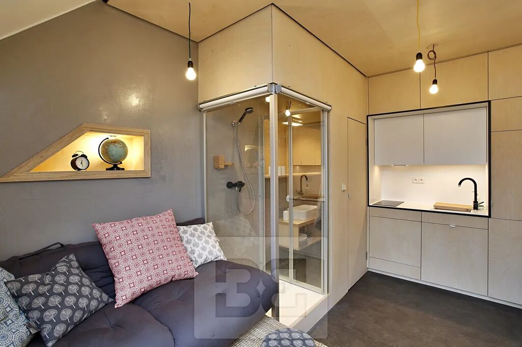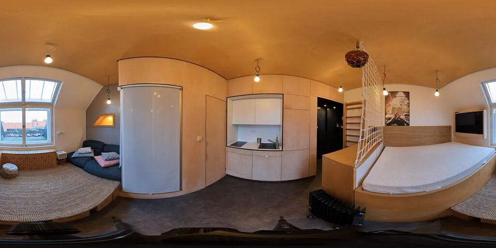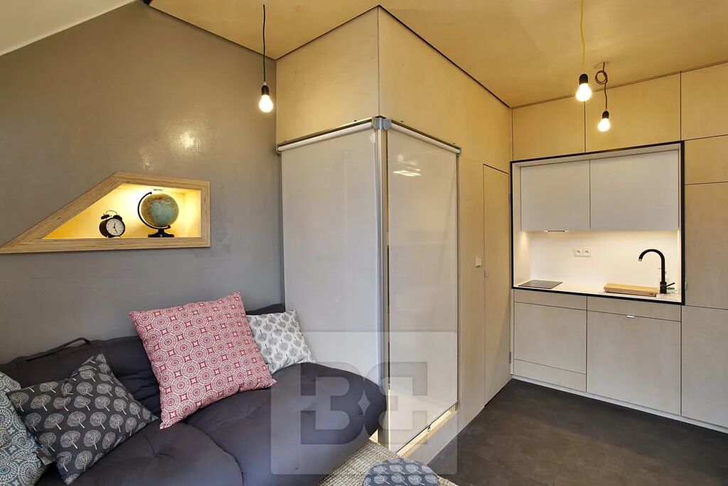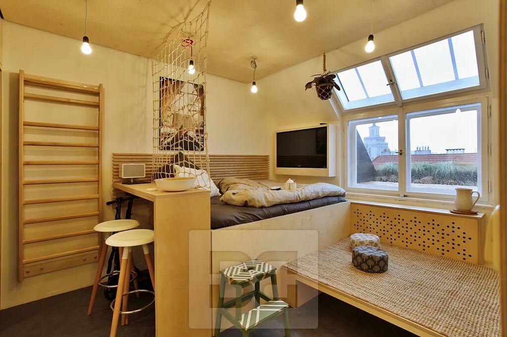 Nabízíme Vám k pronájmu designový byt situovaný v 6. patře domu s výtahem, v ulici Zelená - Praha 6. Jedinečný byt s obytnou plochou pouhých 16 m2 nabízí vše, co potřebujete ke kvalitnímu bydlení a navíc možnost venkovního posezení za oknem s úžasným výhledem na Prahu. Plně vybavený kuchyňský kout s mikrovlnou troubou s grilem, lednicí s mrazákem, myčkou, indukční deskou a digestoří. V kuchyňské lince je také umístěna pračka. Dále je zde oddělená koupelna se sprchovým koutem a toaletou. V pokoji je vyvýšená manželská postel a pro návštěvy poslouží rozkládací matrace vedle postele. Deska na jejím kraji se dá sklopit a tak umožní posezení pro 4. osoby. Zcela ojedinělé je posezení v okně viz foto. Byt si zasloužil článek v Prima Living viz odkaz - https://living.iprima.cz/design/microliving-cesko-garsonka-rekonstrukce-minibyt. K bytu náleží balón přístupný přes chodbu. Doporučuji prohlídku!