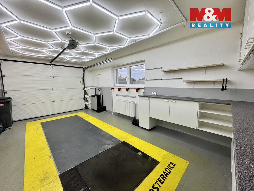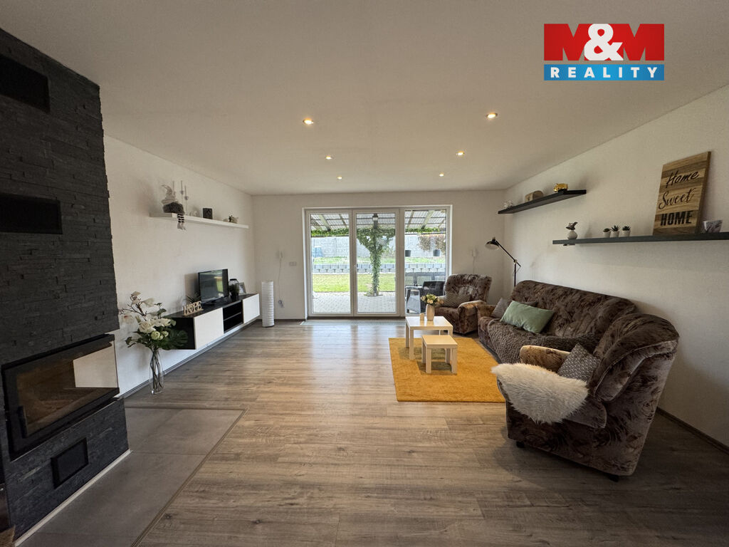 Srdcem domu je velkorysý obývací pokoj s kuchyňským koutem, krbem na dřevo, klimatizací a přímým vstupem na terasu. Dispozice domu dále zahrnuje tři samostatné pokoje, koupelnu, WC, technickou místnost a garáž.