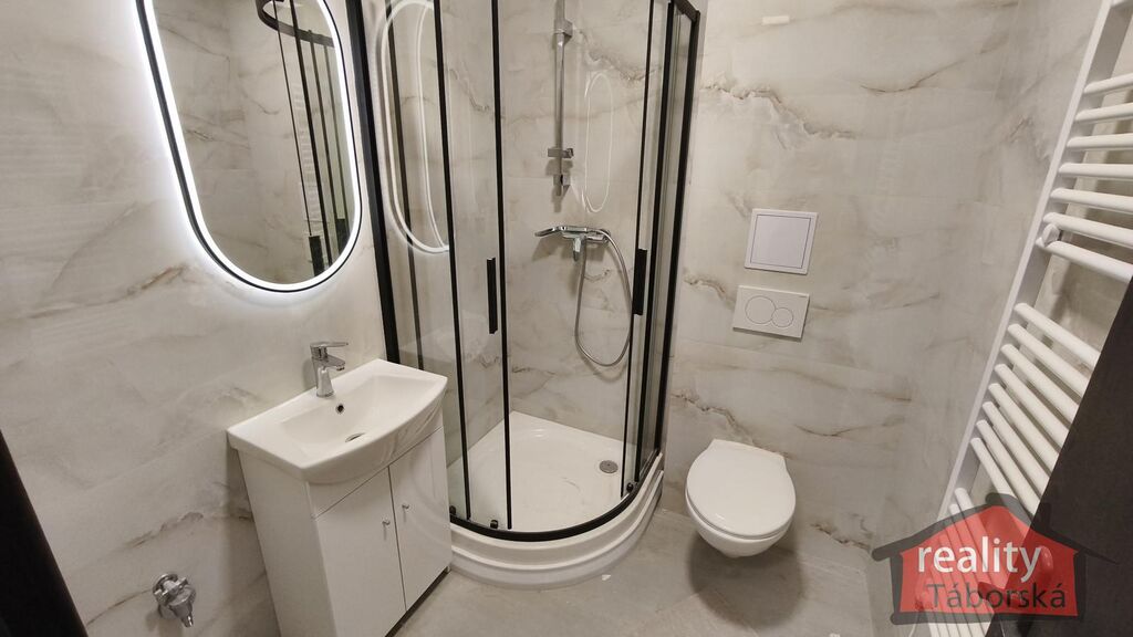 V obývacím pokoji s kuchyňským koutem je laminátová plovoucí podlaha, v koupelně keramická dlažba. V koupelně je sprchový kout, umyvadlo, toaleta a prostor na pračku s připravenými vývody na vodu a odpad. Provedení ve standardu, není potřeba dokončovacích prací. V bytě jsou plastová tříkomorová okna a bezpečnostní vstupní dveře, které jsou uvnitř foliované. Vchodové dveře do domu mají bezpečnostní zámek ovladatelný z mobilního telefonu.