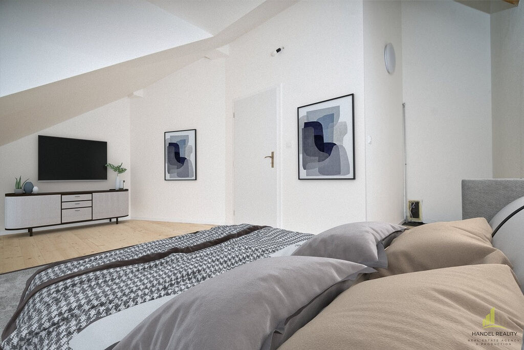 Původní krov bytu přidává na charakteru a jedinečnosti prostoru. Vedle obývacího pokoje se nachází prostorná ložnice a moderně zařízená koupelna, která splní veškeré vaše požadavky na komfort.