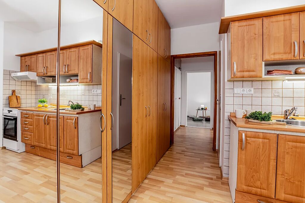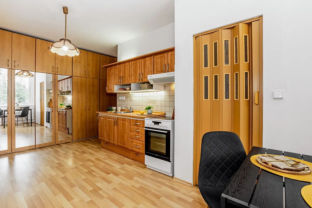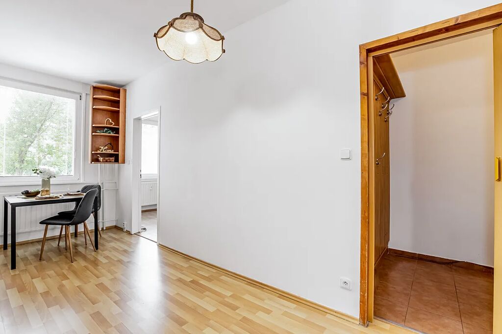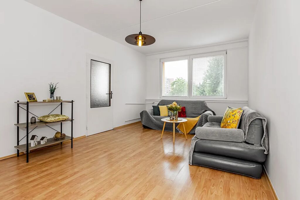 Dispozice bytu zahrnuje prostorný obývací pokoj, kuchyni s jídelním koutem, dvě samostatné ložnice, koupelnu, samostatné WC a předsíň. Kuchyňská linka je vybavena el. troubou s varnou deskou a digestoří.