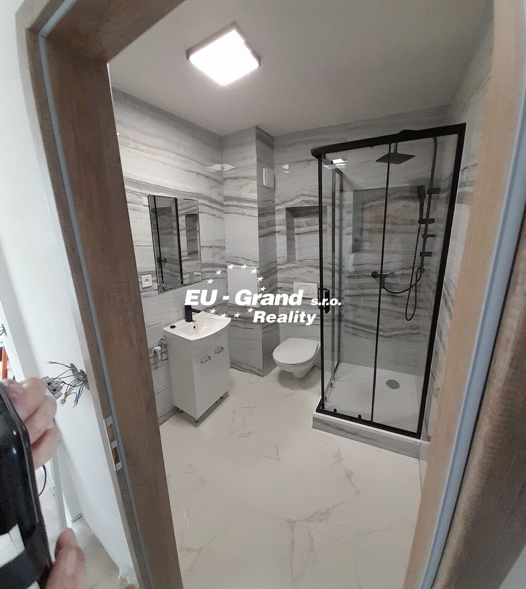 Koupelna je společná s WC. Je vybavená umyvadlem, sprchovým koutem a dostatečným prostorem pro umístění pračky.