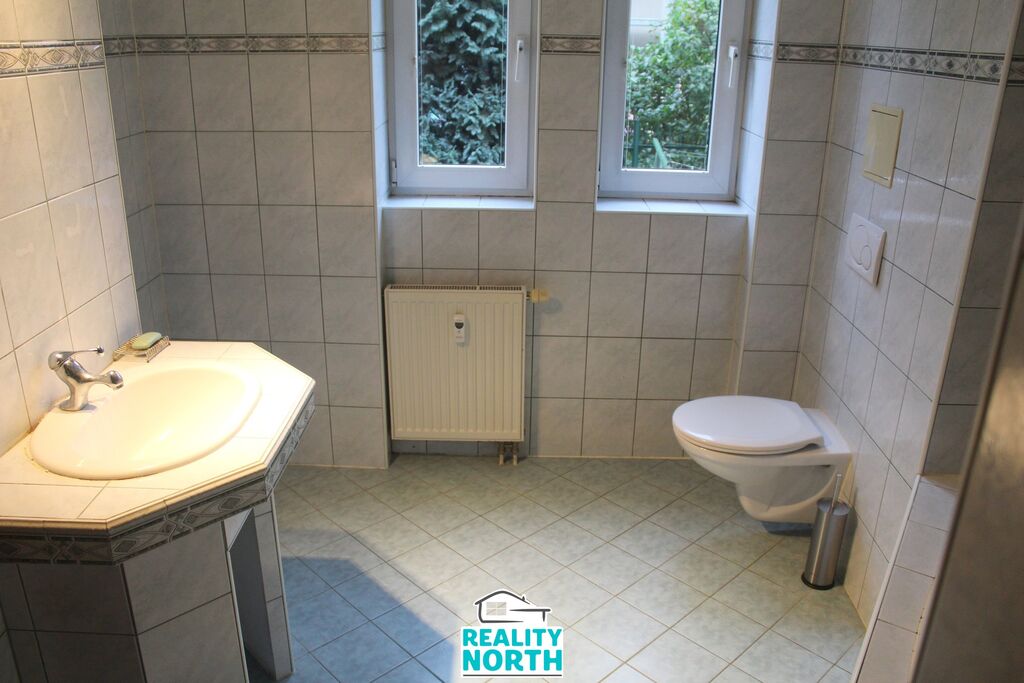 Koupelnové jádro je zděné s rohovou vanou, umyvadlem a WC.