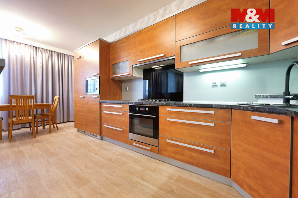 Interiér tvoří kuchyň s linkou na míru se spotřebiči (plynová deska, el. trouba, mikrovlnná trouba, lednice, myčka) a kuchyňským ostrůvkem navazujícím na obývací část se sedačkou, knihovnami a jídelním koutem. Další dva pokoje jsou samostatně přístupné i vzájemně průchozí. K dispozici je prostorná komora, šatna, koupelna s vanou a sprchovou zástěnou, samostatné WC.