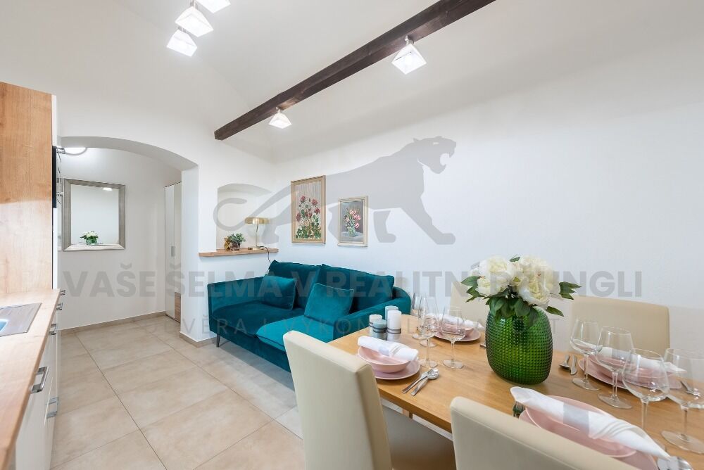 byt zařízený, kuchyň s vestavěnými spotřebiči + pračkosušička.
