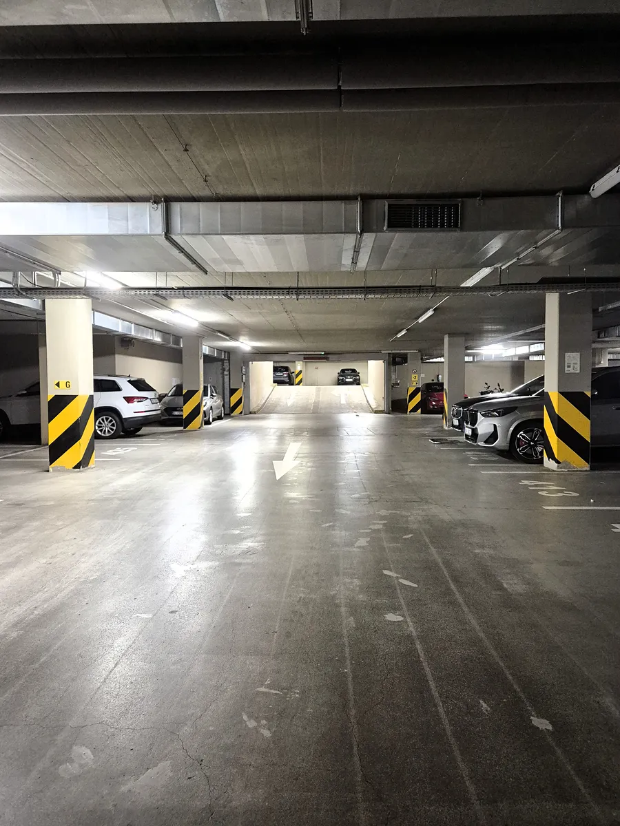 Parkovací stání se nachází ve 3.podzemním podlaží a má podlahovou plochu cca 13m2. Rozměry 2,4m x 5,5m.