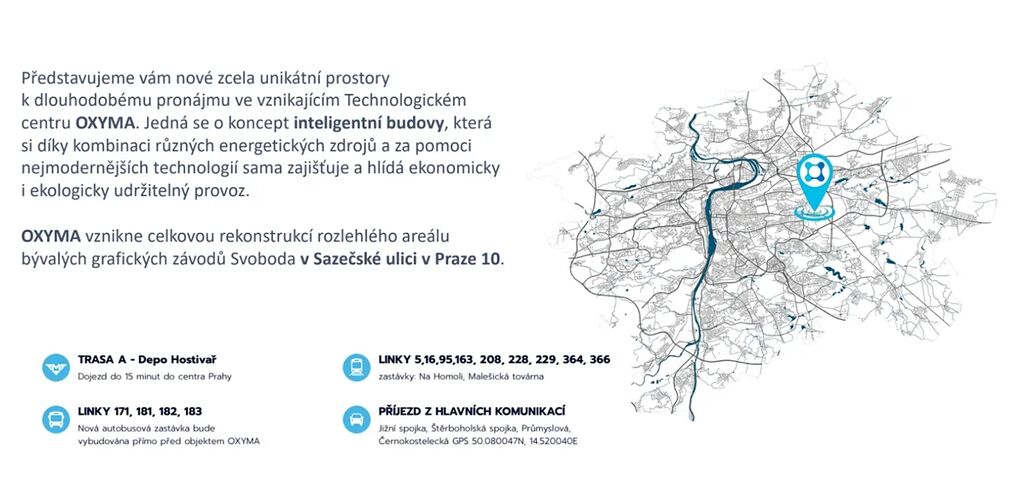 V zastoupení majitele Vám nabízíme k pronájmu moderní komerční prostory v Technologickém parku OXYMA, Praha 10 - Malešice. Projekt nabízí moderní prostory v kombinaci skladu, lehké výroby, kancelářského zázemí, či showroomu. Vše lze přizpůsobit přesně podle Vašich potřeb.