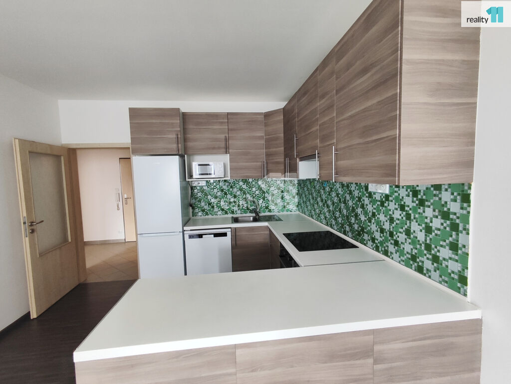 Dominantou bytu je zánovní kuchyňská linka vybavená varnou deskou, troubou, myčkou, novou lednicí s mrazákem a mikrovlnnou troubou – vše v moderním stylu, připravené na každodenní vaření i víkendové vaření pro radost.