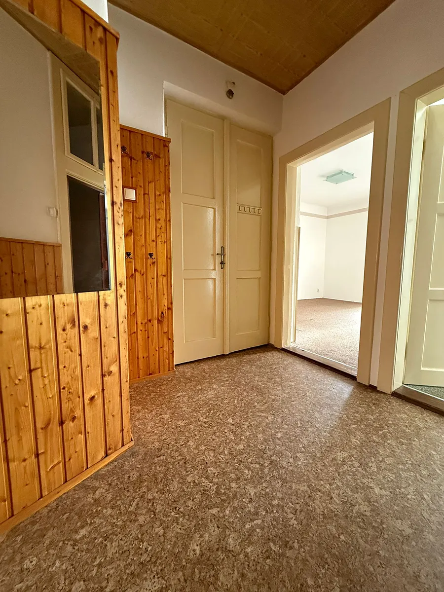 Dispozice bytu zahrnuje vstupní chodbu, prostorný obývací pokoj, ložnici, kuchyň s jídelním koutem, koupelnu s vanou, samostatné WC a spíž.