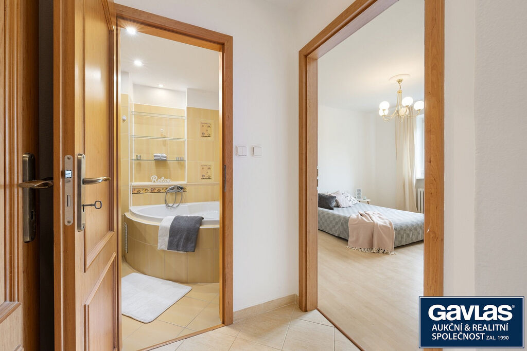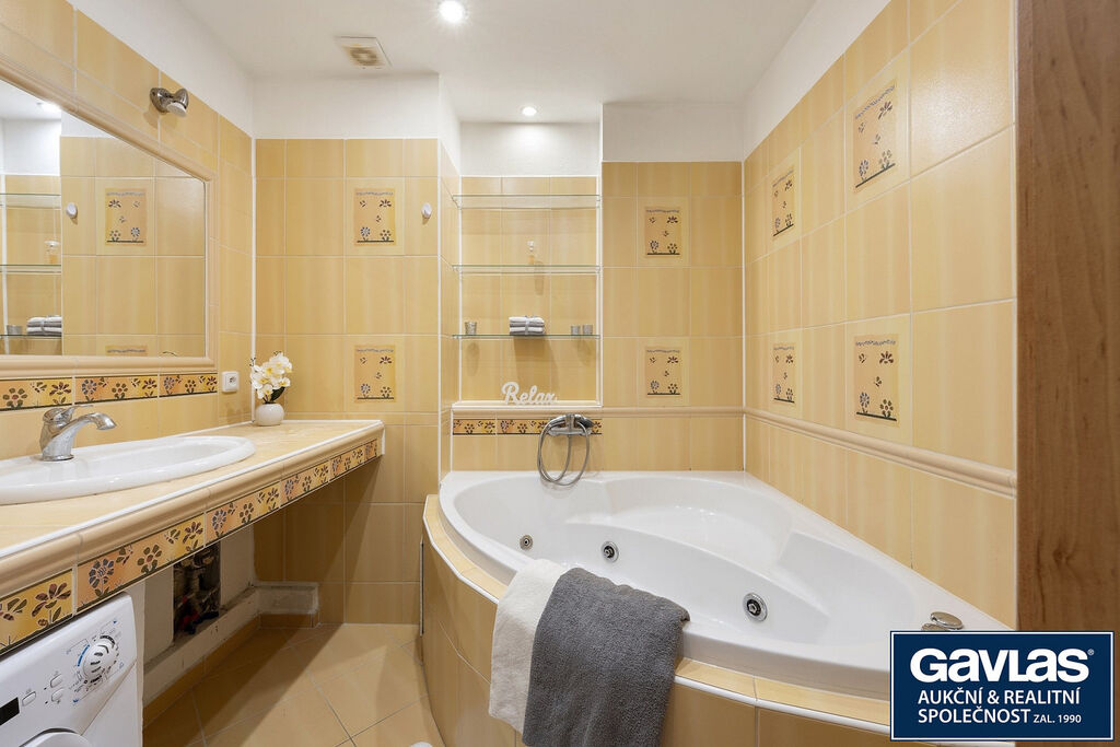 • Koupelna s rohovou vanou, umyvadlem, dostatkem úložného prostoru a pračkou.
