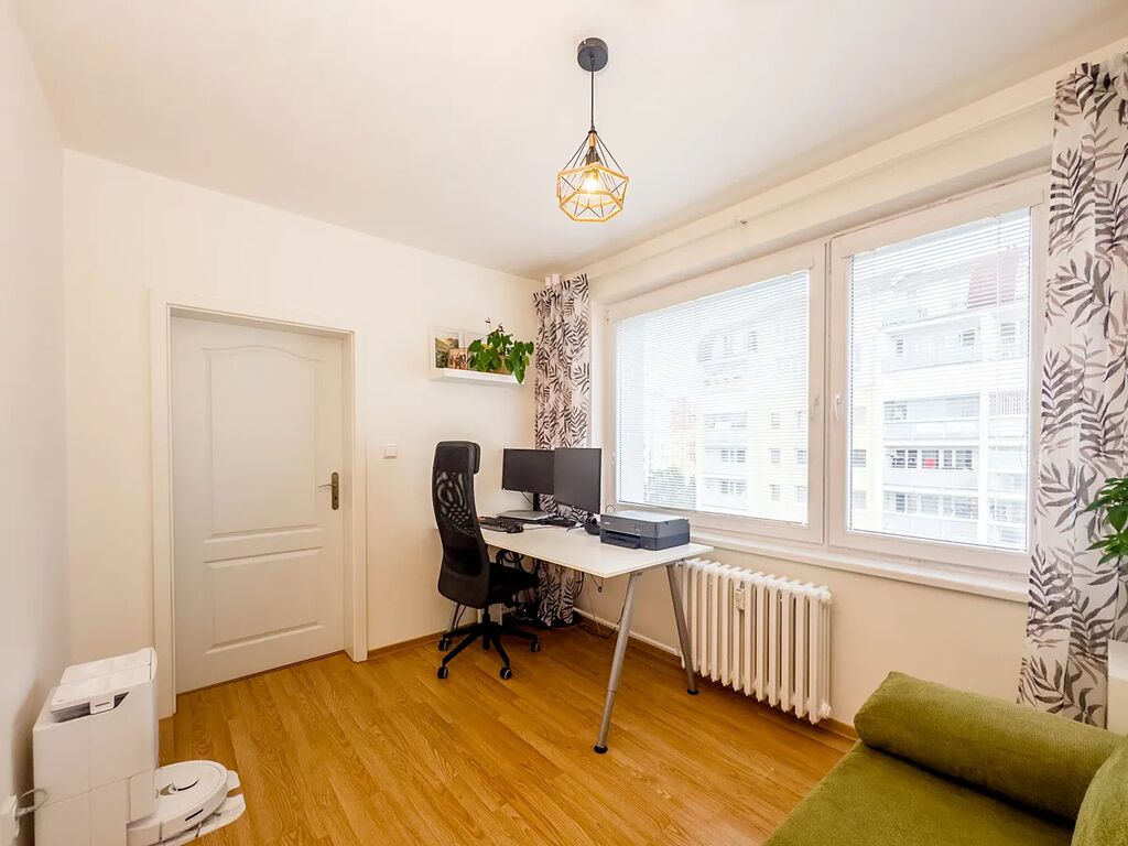 Ze vstupní haly, která slouží zároveň jako šatna, je přístupna luxusní koupelna s rohovou vanou. Toaleta s umyvadlem je řešena také jako samostatná místnost. Následuje poté prostorná kuchyně s jídelním koutem a na míru navrženou kuchyňskou linkou se zabudovanými spotřebiči, která zajistí budoucímu majiteli dostatek prostoru k vaření či uložení nádobí. Z kuchyně je přístupný prostorný balkon. Ze vstupní haly se dostanete do ložnice s vestavěnými skříněmi. Na obývací pokoj navazuje prosvětlená pracovna, kterou lze využít i jako dětský pokoj. Bytová jednotka působí velice pozitivním světlým dojmem, přičemž z oken jsou krásné výhledy do okolí.