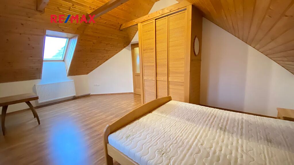 Nejzazší místností je útulná ložnice s manželskou postelí a šatní skříní. Celý byt díky dřevěným prvkům působí velice teple a útulně.