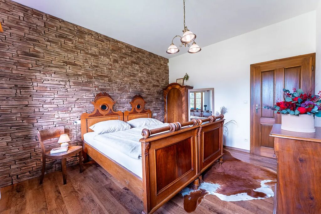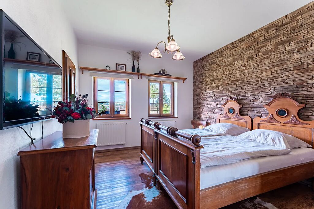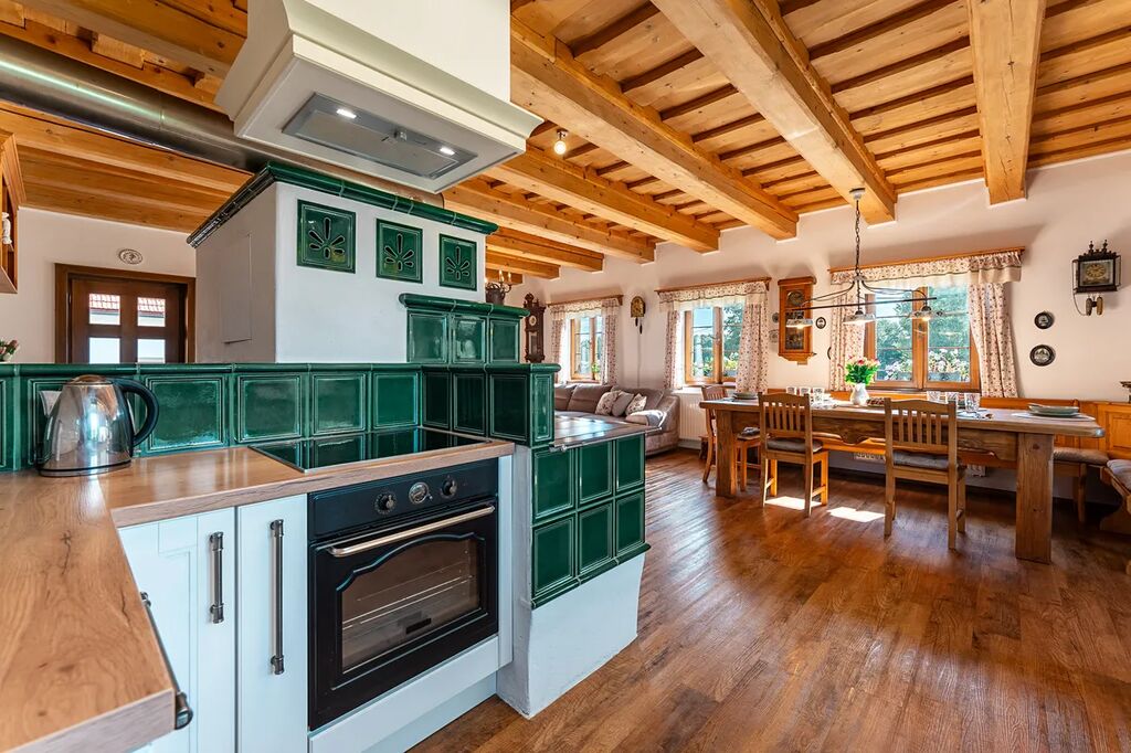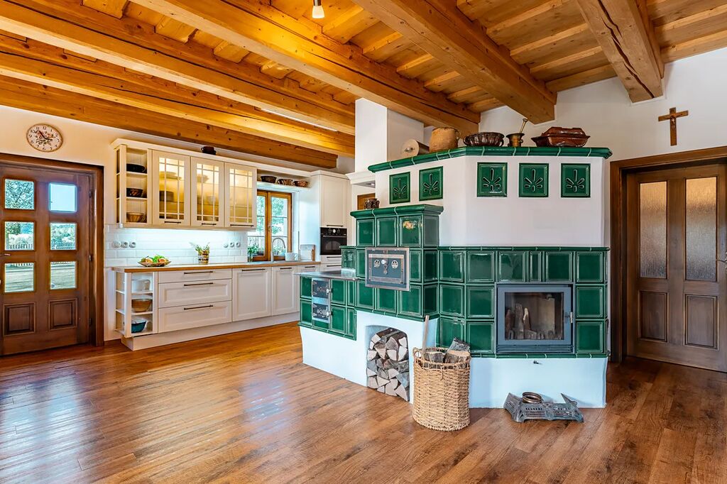 • Stylově zrekonstruovaná chalupa (společenská místnost s kachlovými kamny a kompletně vybavenou kuchyní, 5 pokojů, 3 koupelny,).