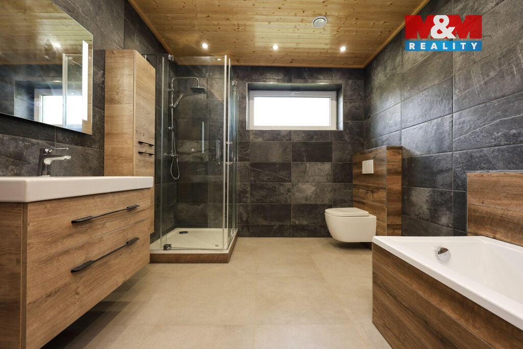 V koupelně najdete vanu, sprchový kout i wc a samozřejmostí je i oddělené WC. Technická místnost a praktická šatna nesmí chybět v každém novém domě!
