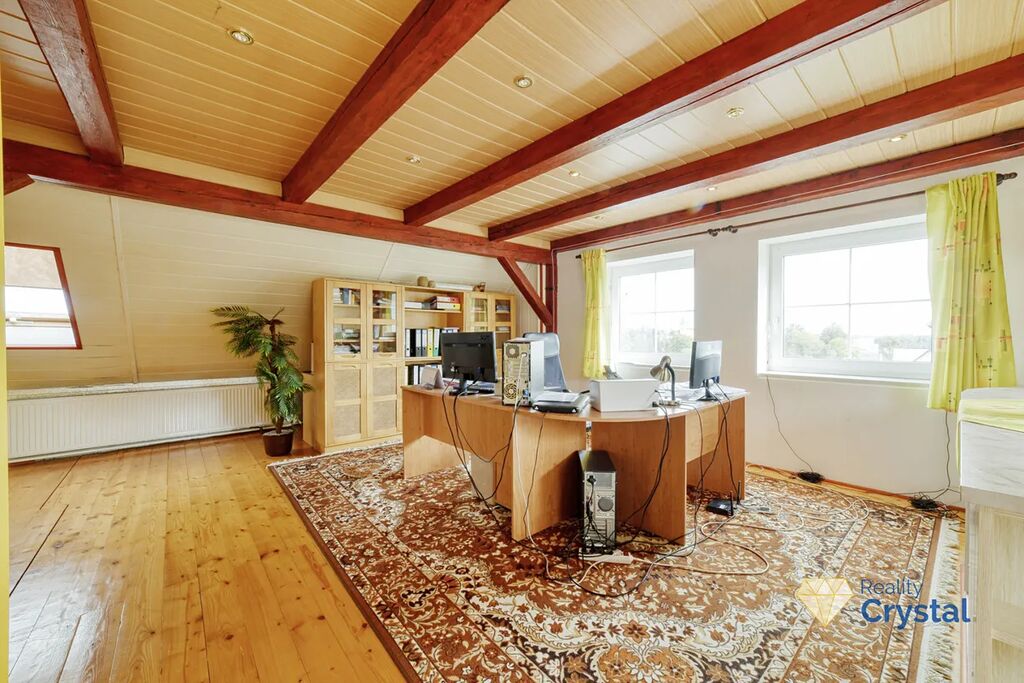 Obytné podkroví tvoří prostorný obývací pokoj s kuchyní a pracovnou, wc a koupelna se sprchovým koutem o rozloze cca 74 m2.
