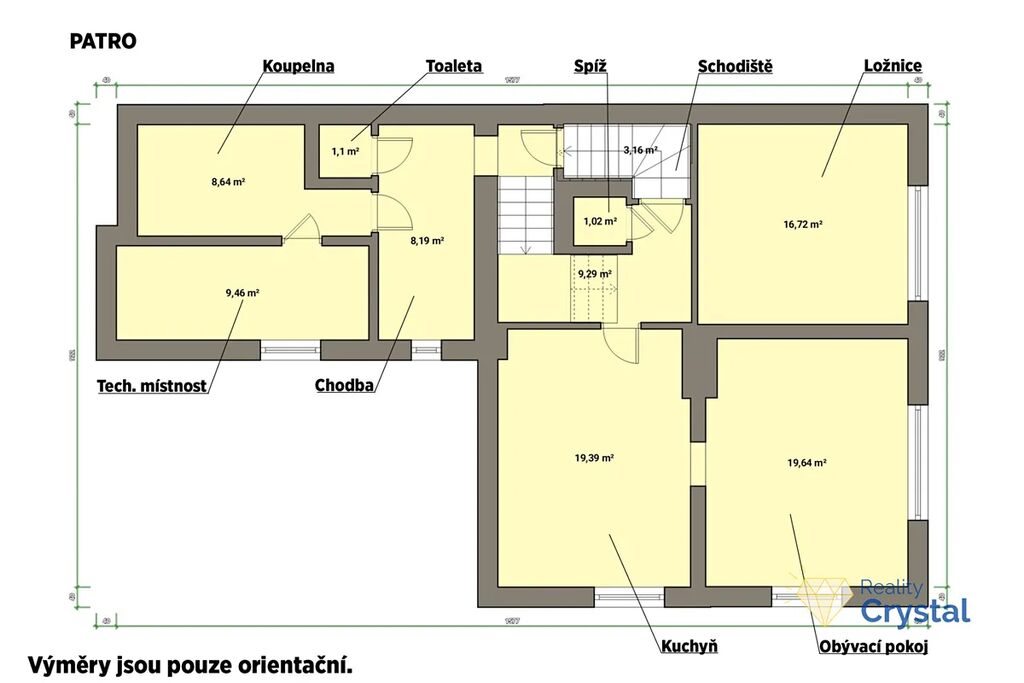 První patro tvoří chodba, prostorná kuchyň s jídelnou, obývací pokoj, ložnice, koupena s vanou, samostatné WC a technická místnost o rozloze cca 93 m2.