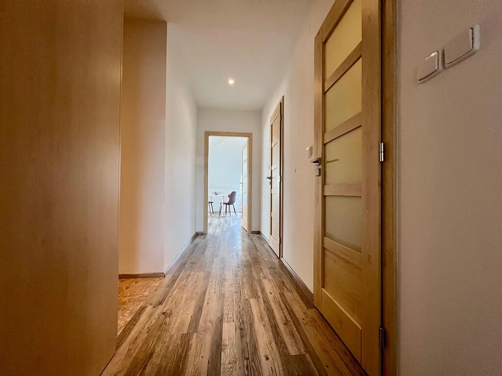 Z prostorné předsíně vstoupíte do dvou oddělených pokojů, pracovny, koupelny a na toaletu. V předsíni a v ložnici naleznete vestavné skříně. V Koupelně s vanou je vestavná skřínka a pračka. Toaleta je samostatná. Velká střešní okna zajištují dostatek světla po celý den. Ložnice je situovaná směrem ke klidnému vnitrobloku.