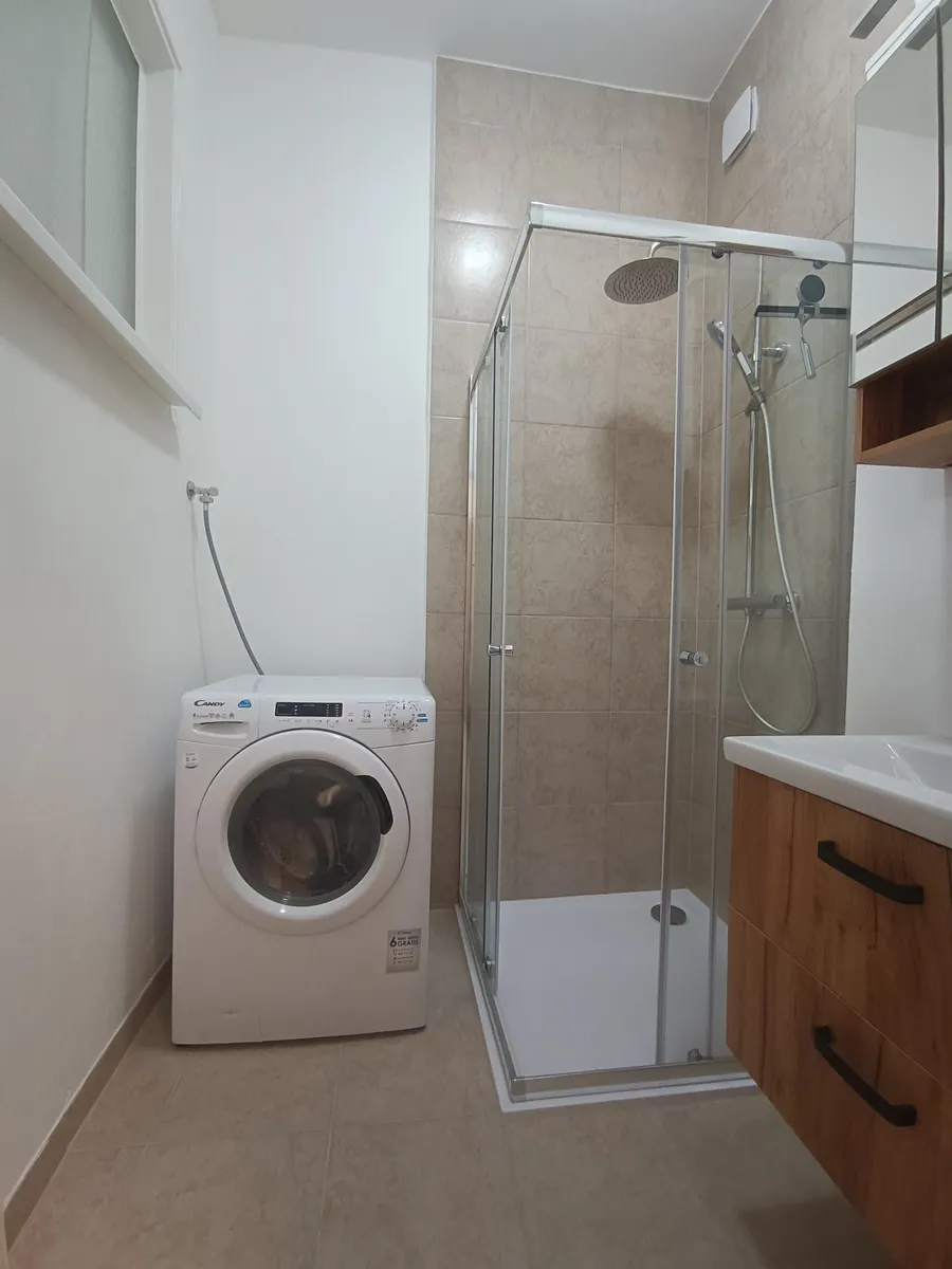 Koupelna: sprchový kout, umyvadlo se skříňkou, zrcadlo, pračka