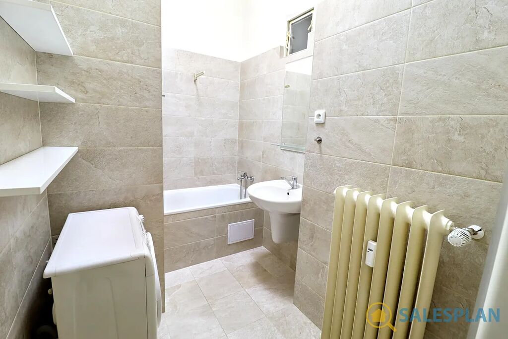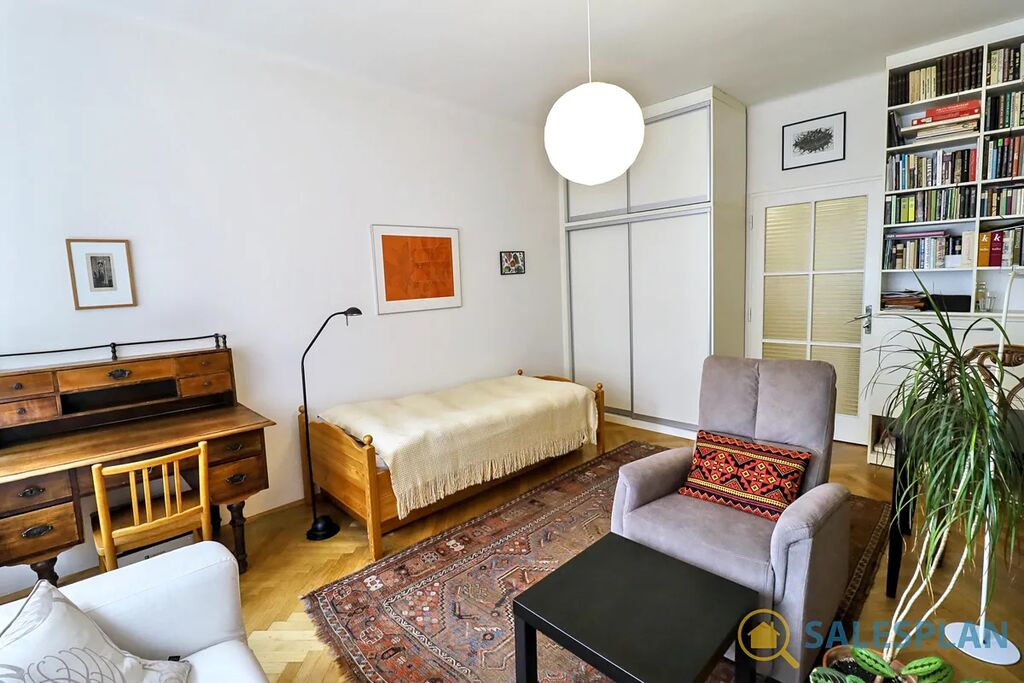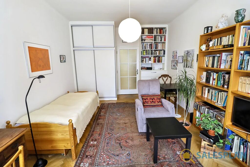 Bytová jednotka v osobním vlastnictví se nachází ve třetím nadzemním podlaží cihlového domu s výtahem. Je ve velmi dobrém a průběžně udržovaném stavu, včetně krásných parket, které jsou zajímavým designovým prvkem celého bytu. Centrální vstupní chodba, vzhledem ke svým rozměrům, poskytla prostor pro efektivní umístění kuchyňské linky. Díky vysokým stropům a renovovaným kastlovým oknům, které jsou téměř přes celou šířku hlavní místnosti, působí jednotka vzdušným a příjemným dojmem. Skvělá jižní orientace zajišťuje prosvětlení interiéru téměř po celý den. K dispozici jsou interiérové rolety. Koupelna a toaleta jsou řešeny samostatně.