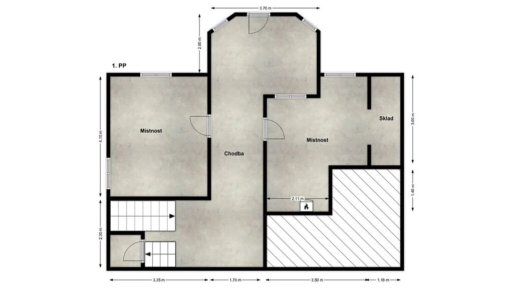 1.NP – zádveří, hala, schodiště, komora, koupelna s WC, pracovna, pokoj, pokoj s kuchyňským koutem