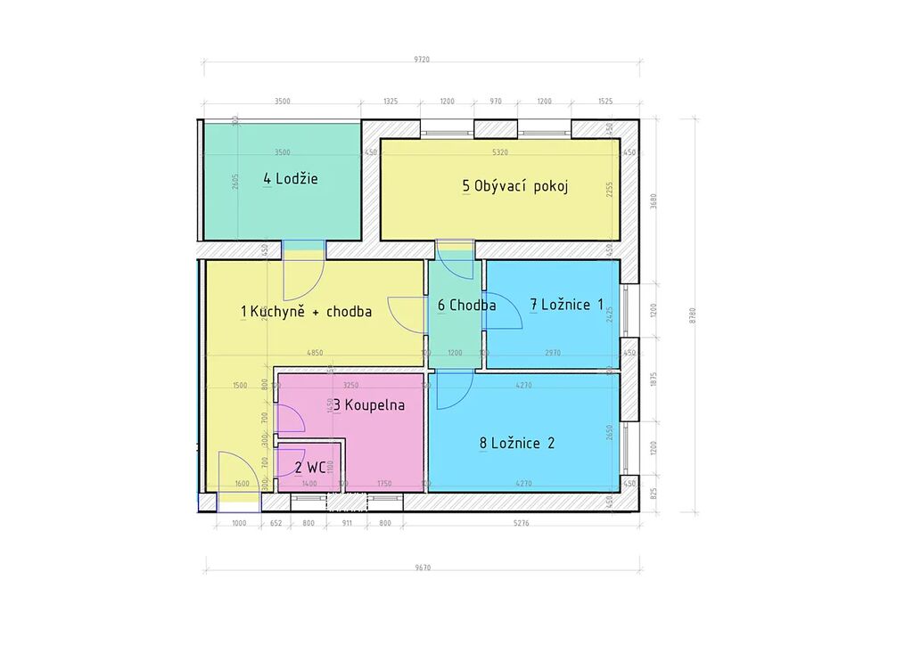 Dispozičně se jedná o 3 neprůchozí pokoje, kuchyni, koupelnu s vanou, samostatné WC, chodbu a prosklenou lodžii s hezkým výhledem na horizont části města. Celková podlahová plocha jednotky činí 67,5 m2 včetně 8 m2 lodžie. K jednotce náleží jedno venkovní parkovací stání.