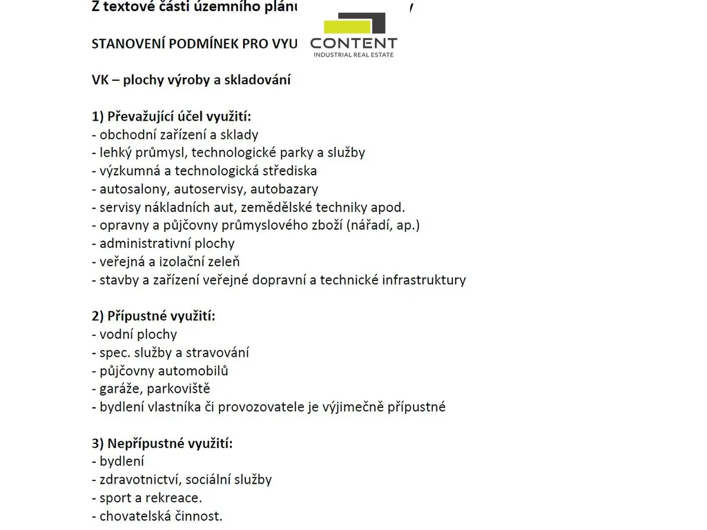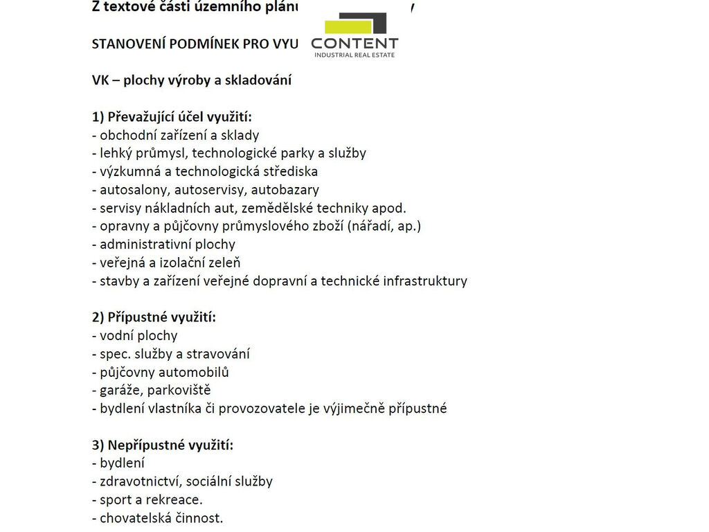 - vhodné využití: výroba, sklad, technologický park, obchod, opravny, autoservisy, autopůjčovny, administrativa,