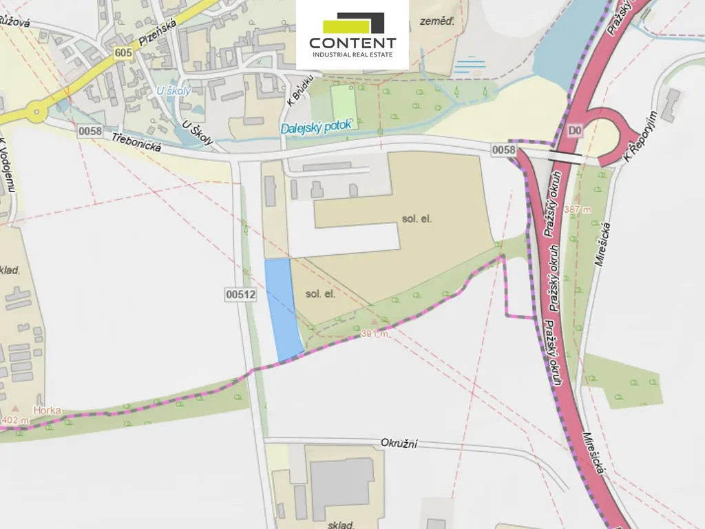 Bez provize nabízíme rovinatý komerční pozemek o výměře: 10158 m² určený územním plánem na plochy (VK) výroby a skladování. Pozemek je dobře přístupný ze sjezdu z Pražského okruhu D0 EXIT 23A.