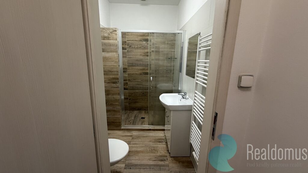 • Koupelna se sprchovým koutem, toaletou, umyvadlem a koupelnovou skříňkou