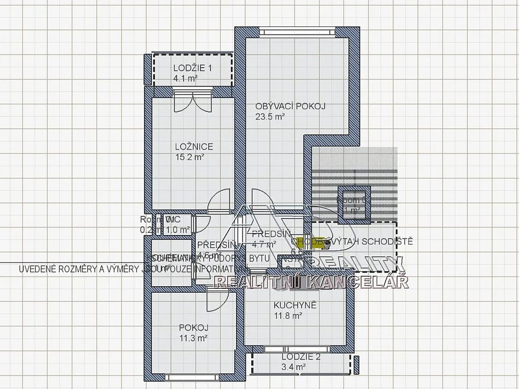 Dispozice bytu: obývací pokoj [23,4m2], samostatná ložnice [15,7m2] s lodžií [0,0m2], samostatný pokoj [11,5m2], kuchyně [11,7m2] s lodžií [4,1m2], prostorná předsíň [10,4m2], koupelna [3,0m2] a WC [0,9m2]. K bytu je k dispozici sklep v 1.NP (technické podlaží – přízemí) domu o výměře cca [2,7m2]. Topení v bytě centrální / ústřední dálkové (radiátory), podružné měření spotřeby teplé a studené vody (vodoměry), samostatné měření spotřeby elektřiny (elektroměr), samostatné měření spotřeby zemní plyn (plynoměr). V bytě je možnost připojení internetu (Starnet) a STA.