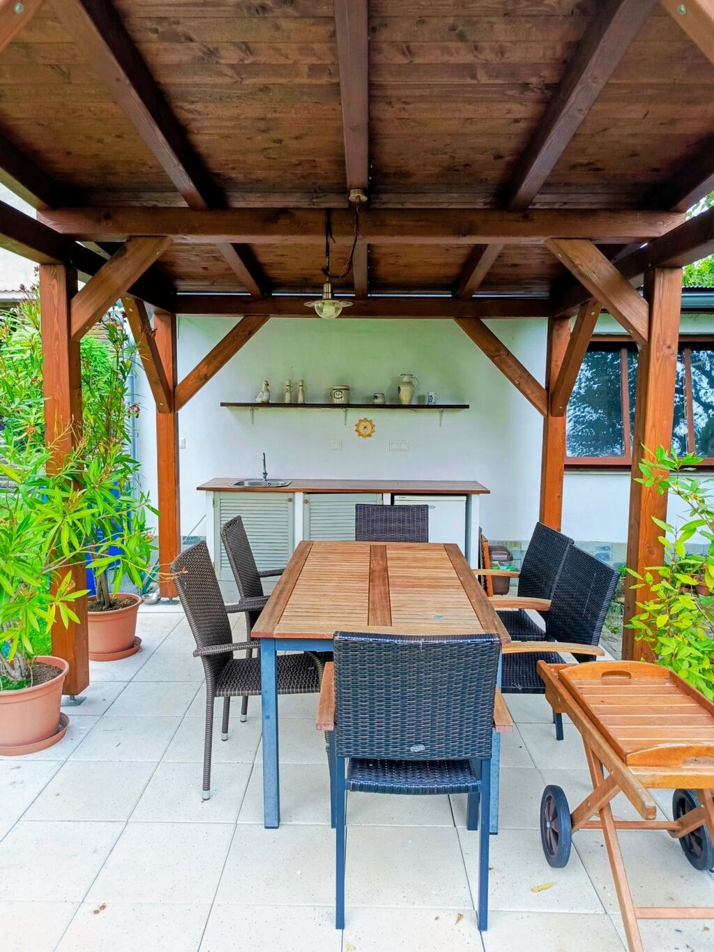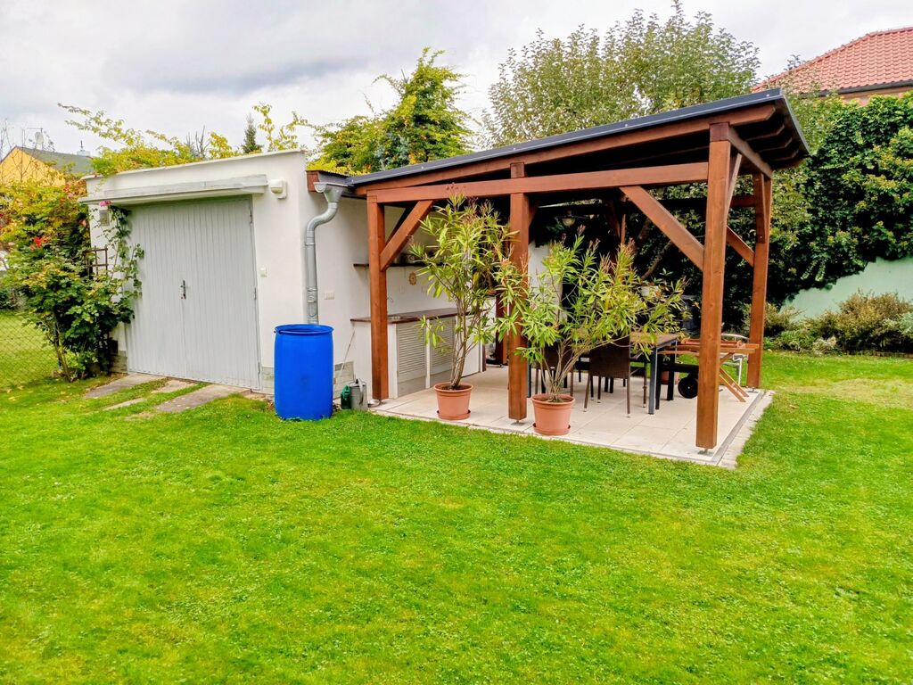 Na zahradě stojí druhá garáž o velikosti 33 m², která je rozdělena na část pro parkování a samostatný sklad na zahradní vybavení či sezónní věci. Na garáž navazuje dřevěná pergola s venkovní kuchyňkou, kde se nachází ideální místo pro posezení s přáteli a rodinou. Zahrada je útulná s několika ovocnými stromy, ideální pro odpočinek nebo pěstování květin a zeleniny.