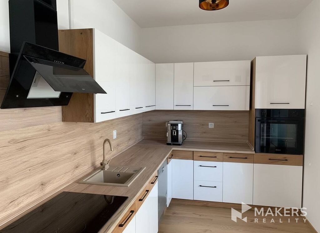 Součástí bytu je moderně řešená kuchyňská část v příjemných světlých tónech. Pracovní plocha i obklad jsou ve stejném dekoru dřeva, což dodává prostoru harmonický vzhled. Kuchyň je plně vybavena – nechybí varná deska, trouba, vestavěná myčka nádobí, moderní odsavač par. Díky množství úložných skříněk a zásuvek je vše prakticky uspořádáno a připraveno k pohodlnému vaření.