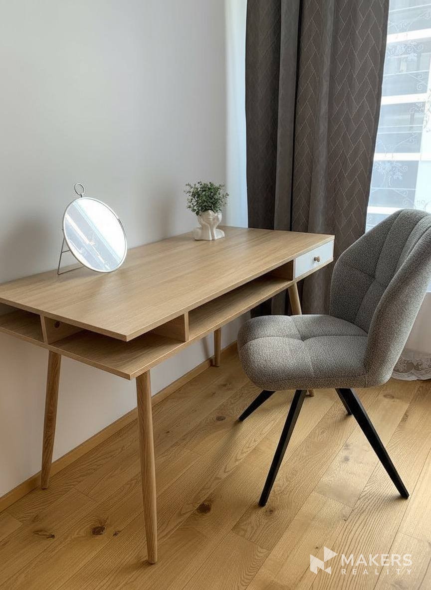 V části bytu určené k odpočinku se nachází pohodlná manželská postel doplněná o dva noční stolky s lampičkami. Interiér působí velmi klidně a harmonicky díky světlým stěnám. Vedle postele jsou umístěny prostorné vestavěné skříně, které nabízejí dostatek úložného prostoru pro oblečení a další věci. U okna je situován pracovní stůl s pohodlnou židlí – ideální pro práci, studium nebo psaní.